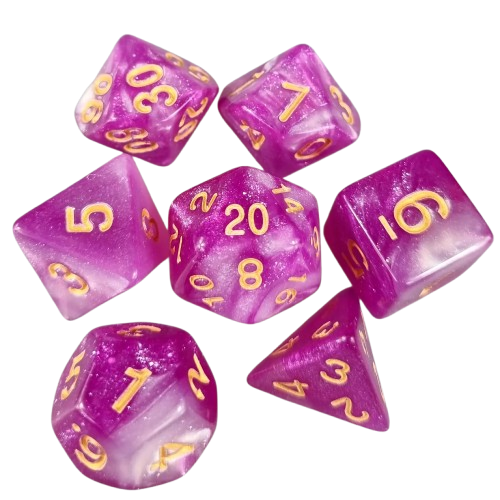 Deze prachtige Arcane polydice set combineert functionaliteit met een spectaculair design. Met zijn betoverende roze en witte tinten en gedetailleerde afwerking voegt deze dobbelstenen set een vleugje magie toe aan elke game sessie.