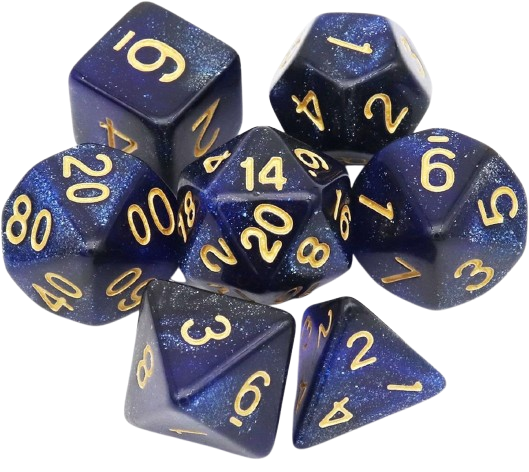 - Complete 7-delige polydice set (d4, d6, d8, d10, d%, d12, d20)